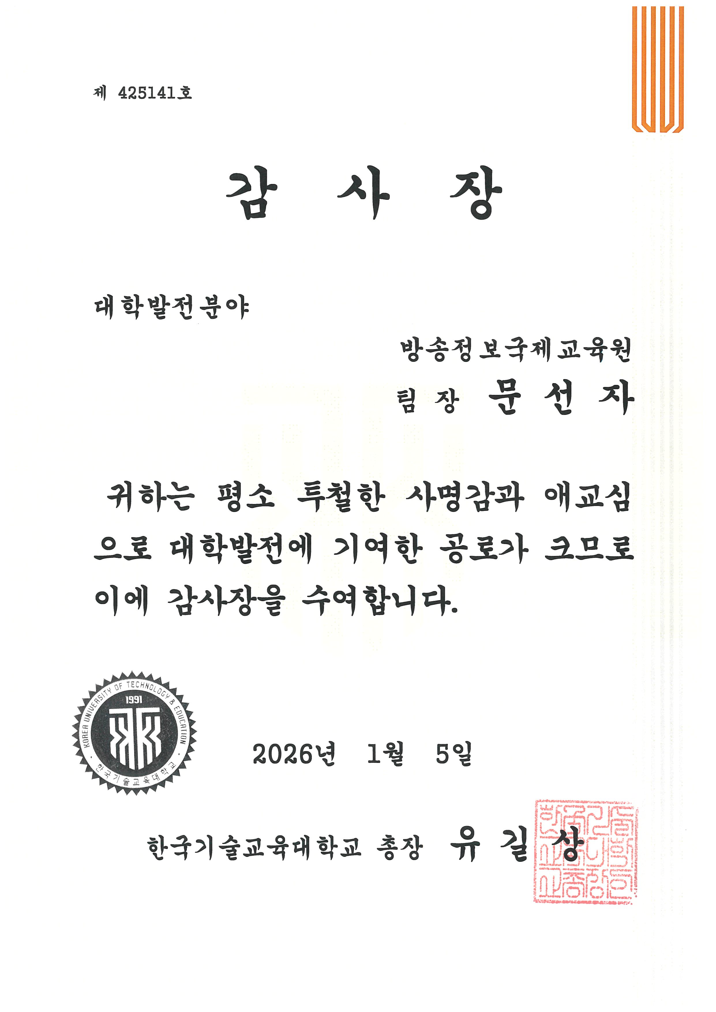 방송정보국제교육원(원장 김윤식)이 1월 5일, 온라인 교육 플랫폼 STEP LMS의 안정적인 운영과 대학 발전에 기여한 공로를 인정받아 한국기술교육대학교(총장 유길상)로부터 감사장을 수여받았다.