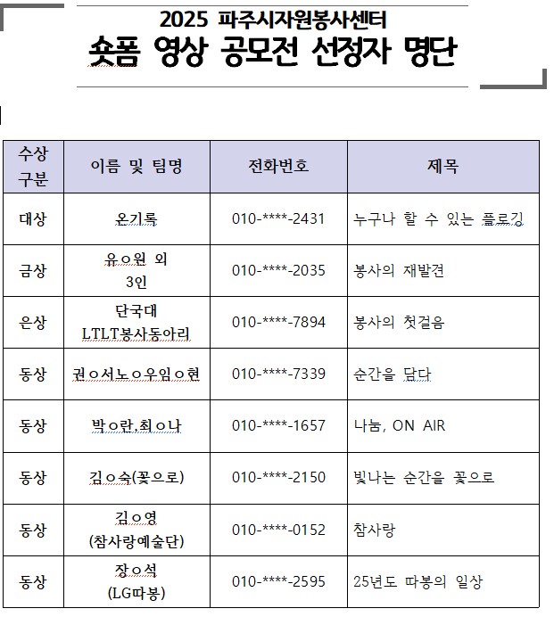 김ㅇ영, 안ㅇ배, 유ㅇ원, 김ㅇ성 교육생이 <2025 파주시 자원봉사센터 숏폼영상공모전> 금상을 수상했습니다.